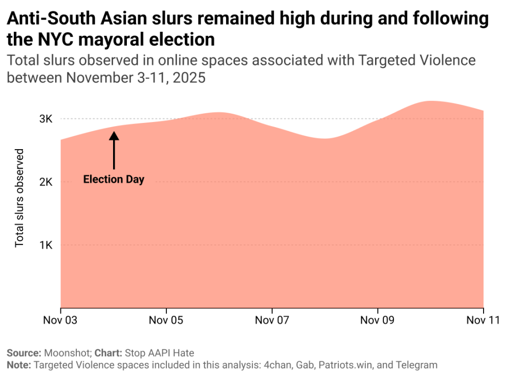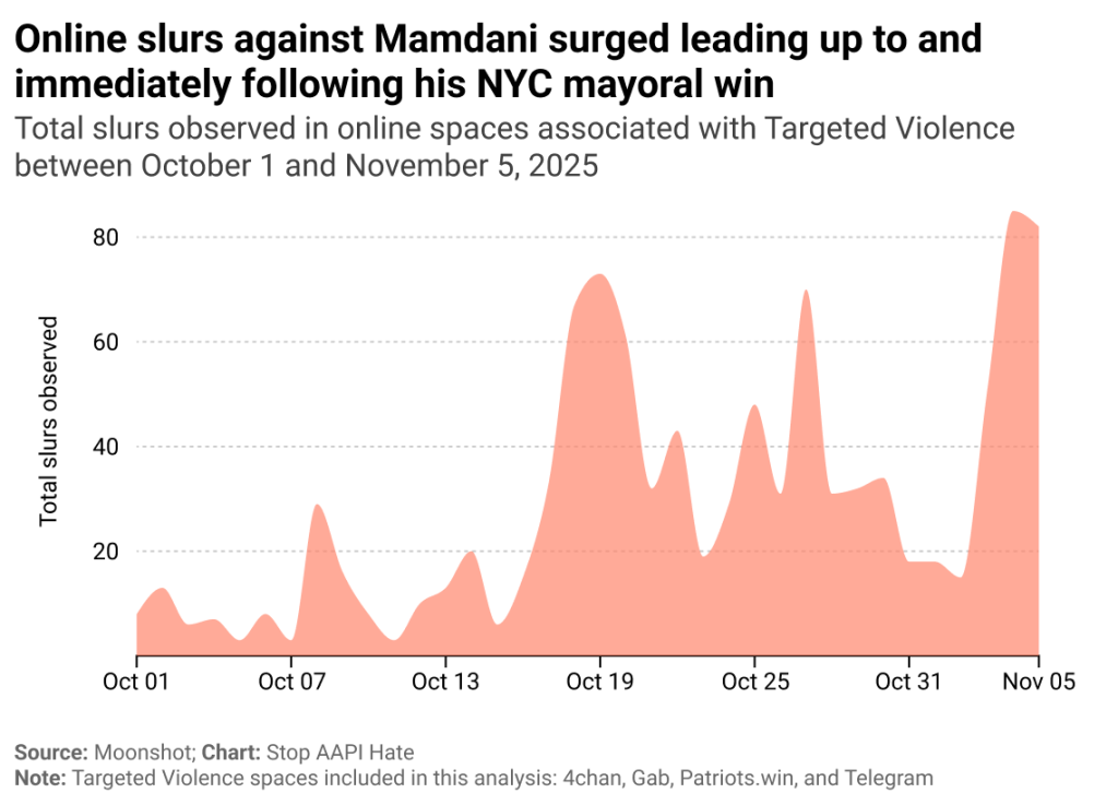 From October 1 through November 11, 2025, new data from Moonshot tracked anti-South Asian content targeting Mayor-Elect Mamdani and the broader South Asian community in online spaces associated with targeted violence. And Stop AAPI Hate’s analysis reveals a substantial rise in hate directed at Mamdani that persisted even after Election Day.