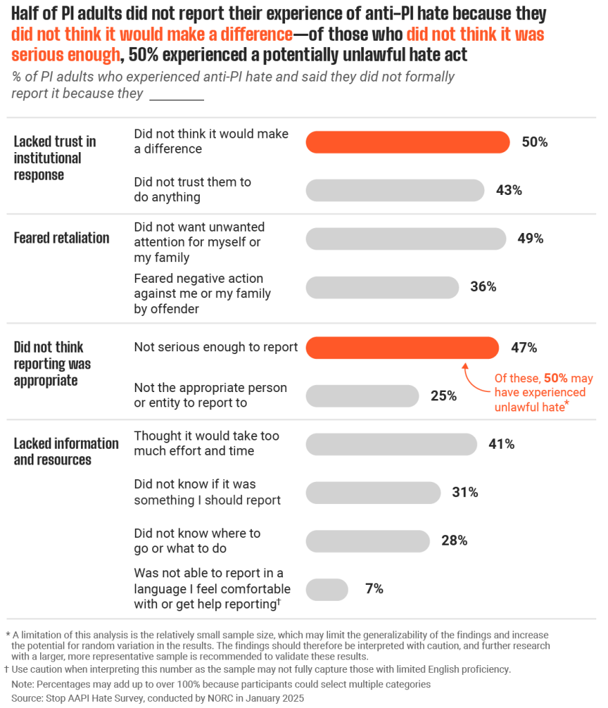 What keeps people from reporting hate? One explanation is a general distrust of institutional responses. Half (50%) of PI adults didn’t think reporting would make a difference and 43% said they didn’t trust the authorities to do something about it.