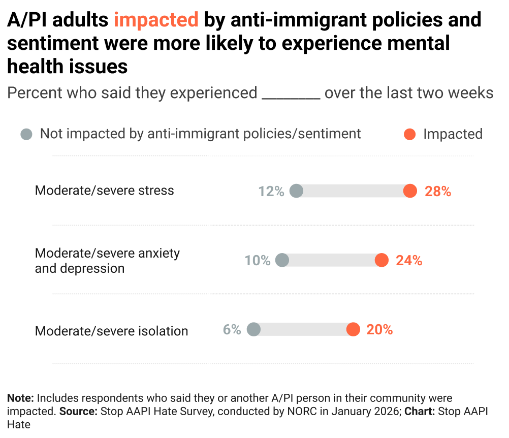 The mental health toll of Trump’s anti-immigrant agenda is also deeply concerning. In the U.S., A/PI adults who felt the impact of anti-immigrant policies and sentiment either directly or in their communities were 1.9 times more likely to report moderate or severe anxiety and depression, as opposed to those who did not.